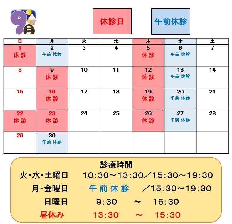 2024.08.16 / 診療日について 院長よりお知らせ 9月の診療について★ こんにちは(`・ω・´) MOTO矯正歯科です🌙 残暑いかがお過ごしでしょうか? まだじんわりと汗がにじむ季節ですが ここを乗り切れば秋が待っています(´艸`*) 夏ラストスパート頑張りましょう☆ミ さて、9月の診療日についてです。 また、土日のご予約が非常に混み合いやすくなっております。 ご希望の日時がございましたらお早めにご連絡ください★