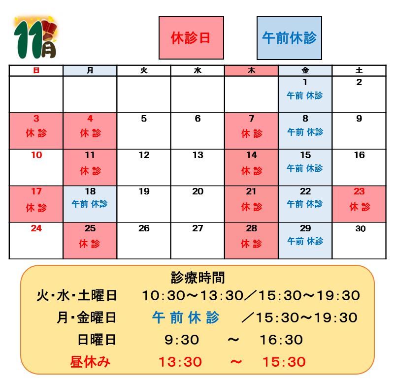 2024.10.15 / 診療日について 院長よりお知らせ 11月の診療について★ こんにちは(`・ω・´) MOTO矯正歯科です📚 本格的に秋に入り 過ごしやすい季節になってきましたね(^^♪ 秋といえば ・読書の秋 ・スポーツの秋 ・食欲の秋 などなど… 楽しみがたくさんありますが 皆さんが一番楽しみたいものは何ですか(・・? さて、11月の診療日についてです。 また、土日のご予約が非常に混み合いやすくなっております。 ご希望の日時がございましたらお早めにご連絡ください★