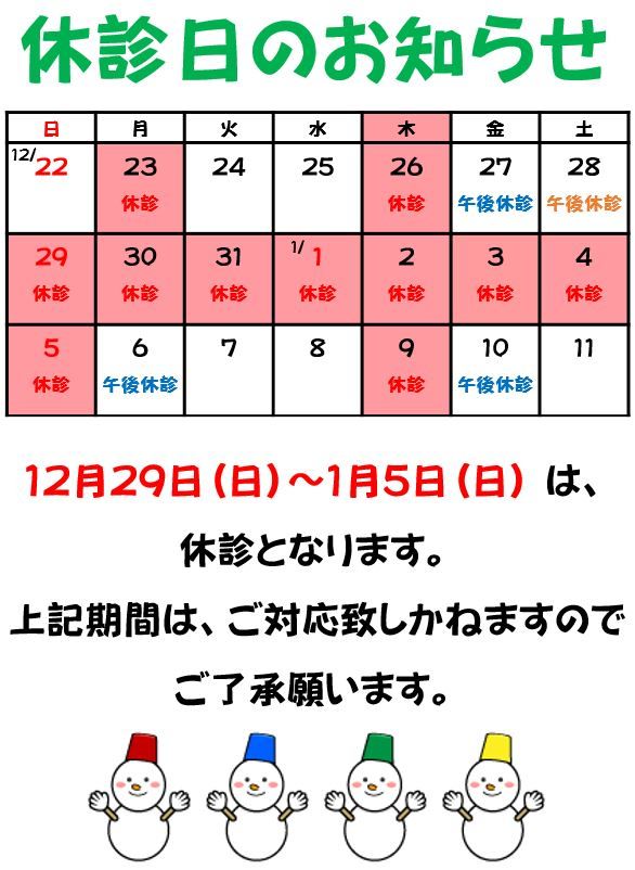 2024.12.07 / 診療日について 院長よりお知らせ 12月の休診日について★ こんにちは🙋 MOTO矯正歯科です!! 今年も残すところわずかになりましたね(^_-)-☆ さて、年末年始の休診日に関してお知らせです。 ※12/29(日)~1/5(日)まで休診となっております。 上記期間中の ホームページからの無料カウンセリングのお問い合わせなどは 休み明けから順次ご対応させていただきますのでご了承ください。