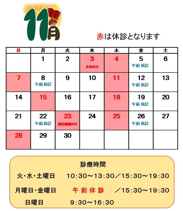 2021.10.13 / 院長よりお知らせ 11月の診療について★ こんにちは😊 MOTO矯正歯科です☆彡 日中は、10月とは思えないほどの暑さですが 朝夕は冷え込むようになり、インフルエンザもはやり始めるころですね。 体調管理には気を付けましょう✿ さて、11月の診療日についてです(#^^#) また、土日のご予約が非常に混み合いやすくなっております。 ご希望の日時がございましたらお早めにご連絡ください★
