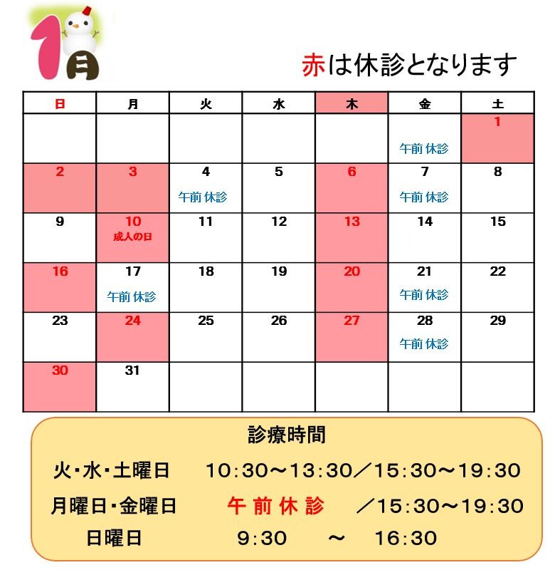 2021.12.17 / 院長よりお知らせ 1月の診療について★ こんにちは😊 MOTO矯正歯科です☆彡 寒さも本格的になり、マフラーと手袋が手放せくなりましたね🧤 今年の冬は特に寒いみたいなので体調を崩さないように気をつけましょう⛄💛 さて、1月の診療日についてです❄ また、土日のご予約が非常に混み合いやすくなっております。 ご希望の日時がございましたらお早めにご連絡ください★