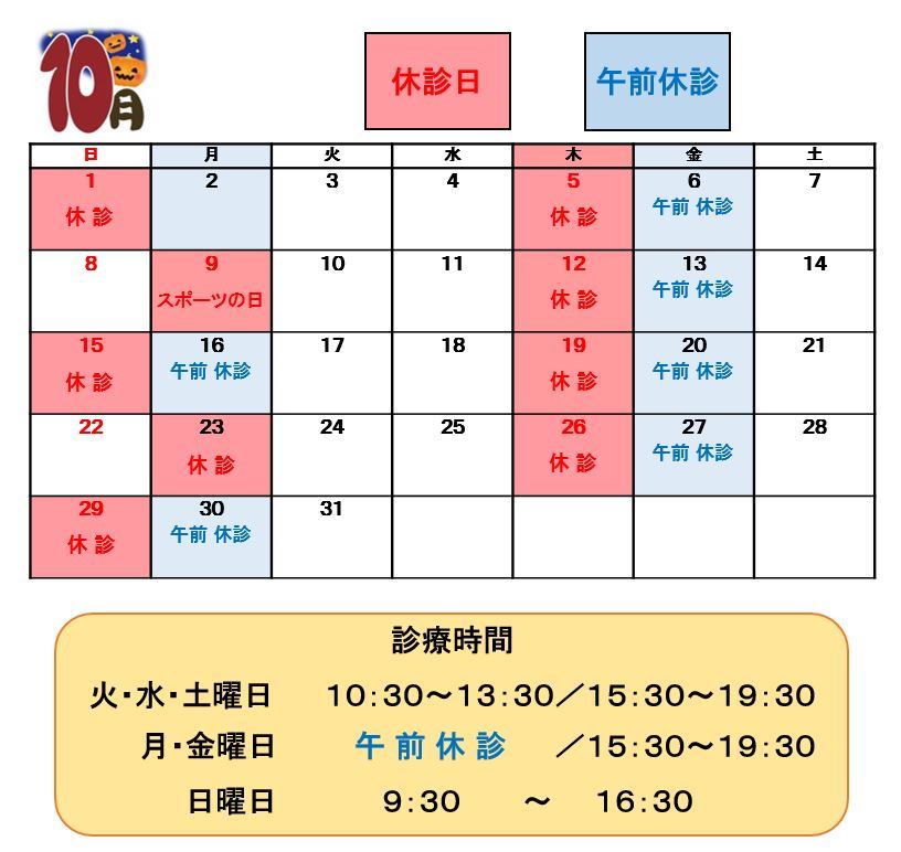2023.09.20 / 診療日について 院長よりお知らせ 10月の診療について★ こんにちは☺ MOTO矯正歯科です🌛 ようやく涼しくなってきましたね(^^♪ 夜は肌寒い日が続きますので 温度差で体調を崩さないようにしていきましょう( `ー´)ノ さて、10月の診療日についてです。 また、土日のご予約が非常に混み合いやすくなっております。 ご希望の日時がございましたらお早めにご連絡ください★