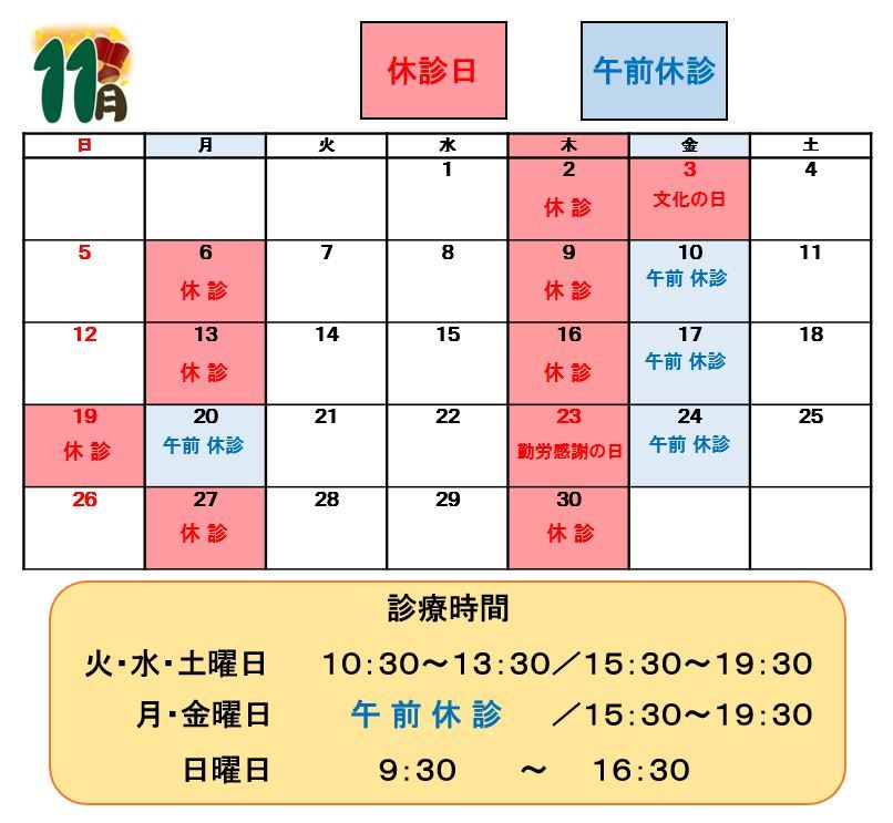 2023.10.20 / 診療日について 院長よりお知らせ 11月の診療について★ こんにちは MOTO矯正歯科です🍠 すっかり秋になりましたね(#^.^#) みなさまは、秋といえば ・スポーツの秋 ・読書の秋 ・食欲の秋 などなど… どのような秋を想像されますか?(`・ω・´) さて、11月の診療日についてです。 また、土日のご予約が非常に混み合いやすくなっております。 ご希望の日時がございましたらお早めにご連絡ください★