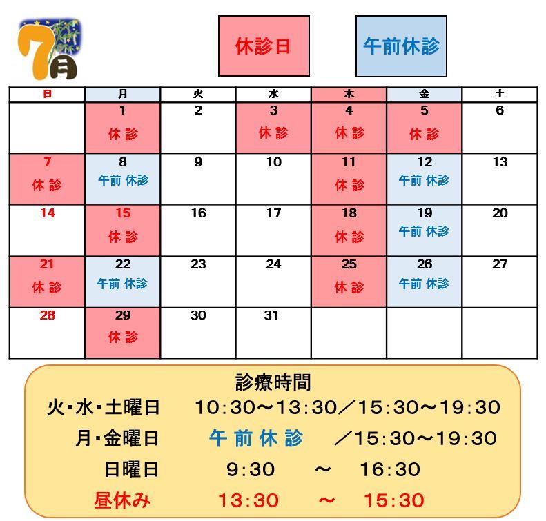 2024.06.20 / 診療日について 院長よりお知らせ 7月の診療について★ こんにちは(*´▽`*) MOTO矯正歯科ですミ 徐々に夏らしくなってきましたね! 夏と言えば、野外で色々なイベントが増える時期かと思います! 急に暑くなっていきますので 皆様、熱中症対策はしっかり行っていきましょう(`・ω・´) さて、7月の診療日についてです。 また、土日のご予約が非常に混み合いやすくなっております。 ご希望の日時がございましたらお早めにご連絡ください★