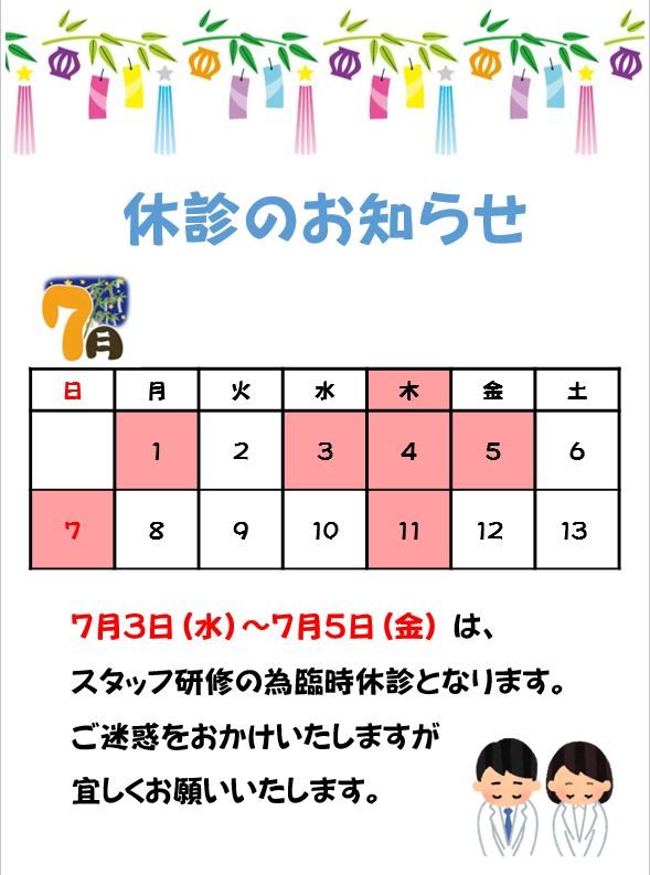 2024.06.21 / 診療日について 院長よりお知らせ 7月の休診日について★ こんにちは(>_<) MOTO矯正歯科です☆ミ 7月の休診日に関しましてお知らせです。 ※7/3(水)~7/5(金)まで休診となっております。 上記の期間中の ホームページからの無料カウンセリングのお問い合わせなどは 休み明けから順次ご対応させていただきますのでご了承ください。